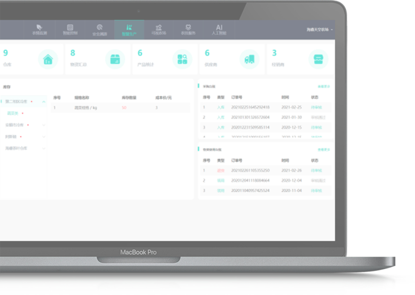 農場智慧生產倉儲管理系統能夠對農場中人、事、物 統一調配、統一管理、統一記錄 ,實現農業倉庫管理的標準化、工序化。提供倉庫基地管理人員在系統上調配、指揮各個生產區域的人員進行各項庫運活動,并形成 實時的庫運報表 。保障農場物資的流動監管及時有效,入庫與發貨正常有序,倉庫物料存量關聯生產的進度,對企業用戶面言,能夠讓用戶 嚴格把控 農場的生產進度。同時,農場倉庫管理在保證企業用戶的正常經營外,還能夠滿足企業供應鏈上下游的需求。通過倉庫管理的 集中調控 ,聯系多個生產者及銷售者的交錯需求,從內到外對服務用戶的管理運營。